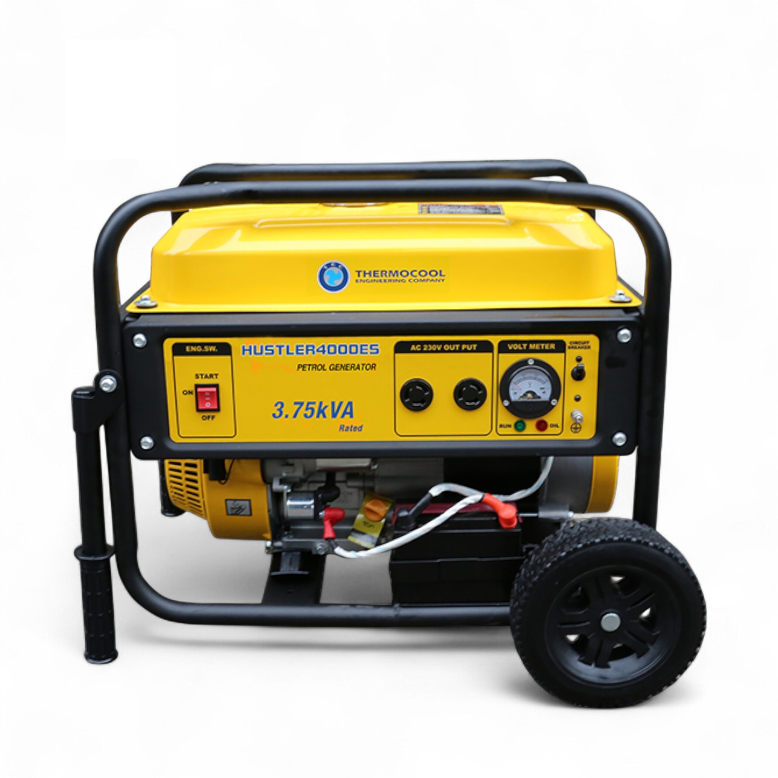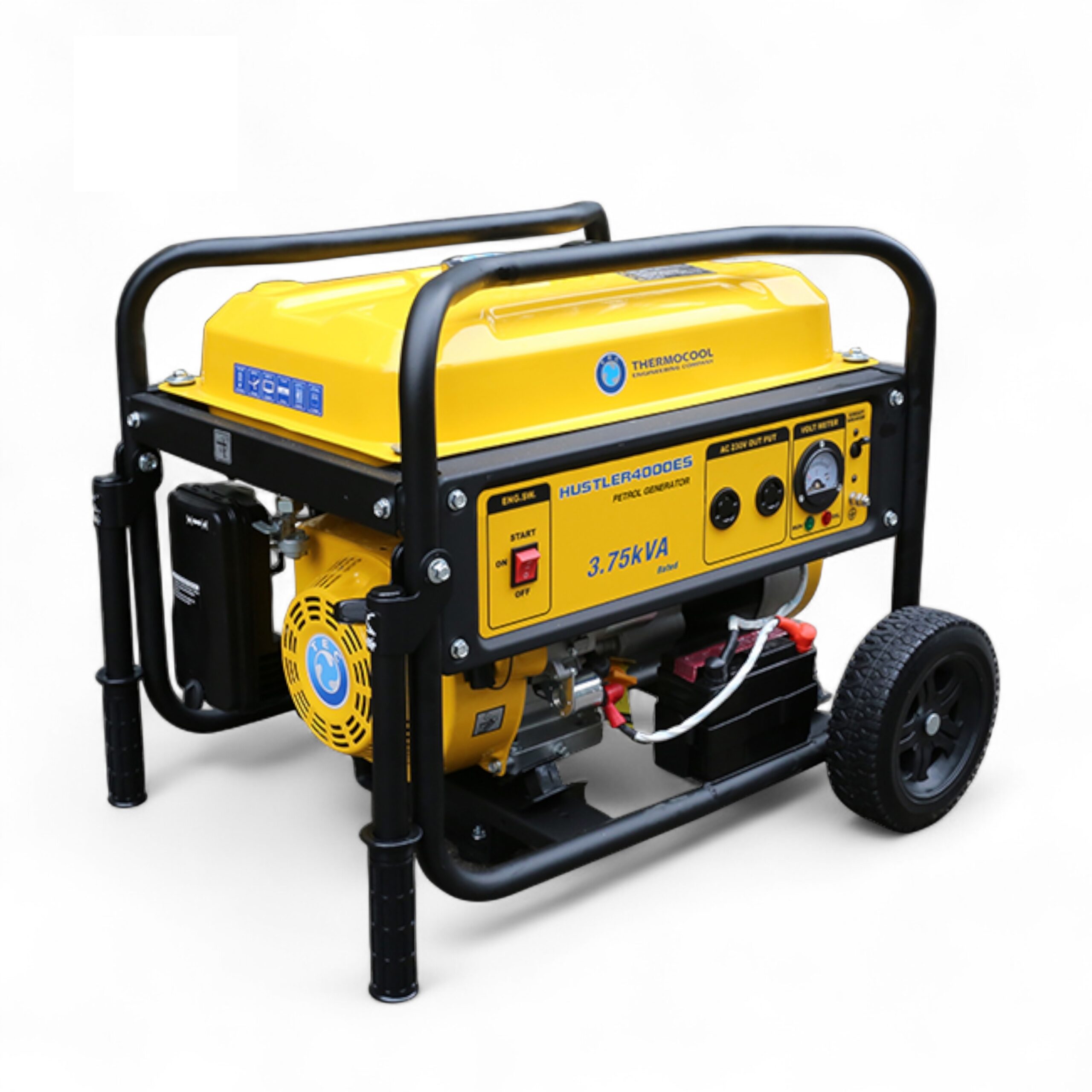Hustler 4000ES. 3.75kVA/3.0kW. Single phase petrol generator. 4 stroke, OHV, forced air cooled, electric start, 223cc single cylinder engine. Suitable for medium loads. E.g. lightings, TV, Fans, Fridge, small AC.